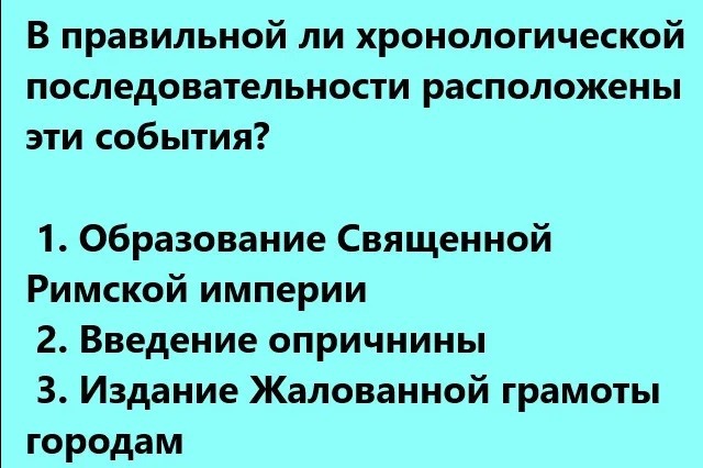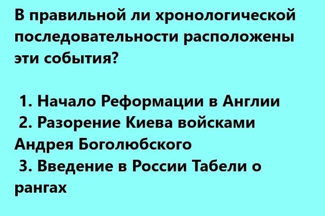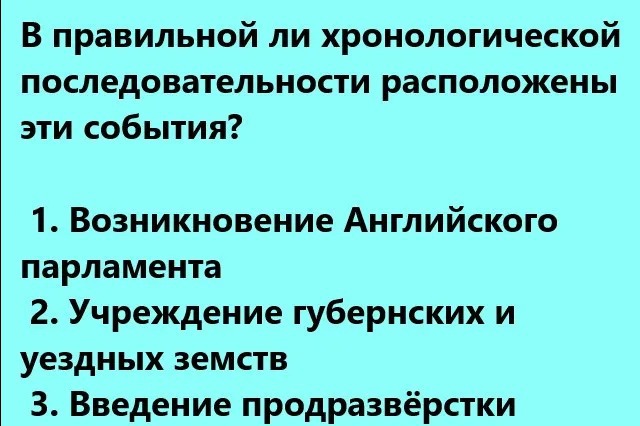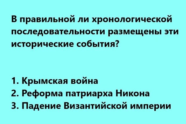 В каждом вопросе этого исторического теста вам будет дано 3 исторических события. Вам необходимо расставить их в хронологическом порядке. И ответить на вопрос — правильно ли мы их расположили по хронологии. Вариантов ответа всего два. Поэтому велик соблазн нажать на удачу. Но постарайтесь пройти его честно.