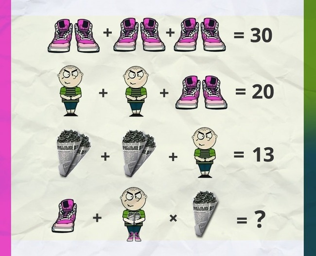 Итак, мы видим картинку, на которой изображены ботинки, мальчик и семечки. Каждый из этих объектов обозначает какое то число. Ваша задача определить какому числу соответствует каждый из предметов и опеределить, чему равно последнее равенство, найти, какая цифра под знаком вопроса.