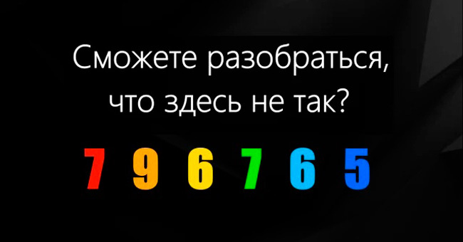 Мы предлагаем вам на секунду отвлечься и пораскинуть мозгами над этой небольшой задачей. Не думайте, что здесь всё так просто, — головоломка может застать вас врасплох. Перед вами ряд цифр, у каждой цифры есть свой цвет, выбранный не случайно. Вам предстоит разобраться, что не так с цифрами и цветами. Задача решается довольно быстро, если понять принцип, по которому эти цифры изначально расставлялись. Ну что, готовы? Давайте приступим.