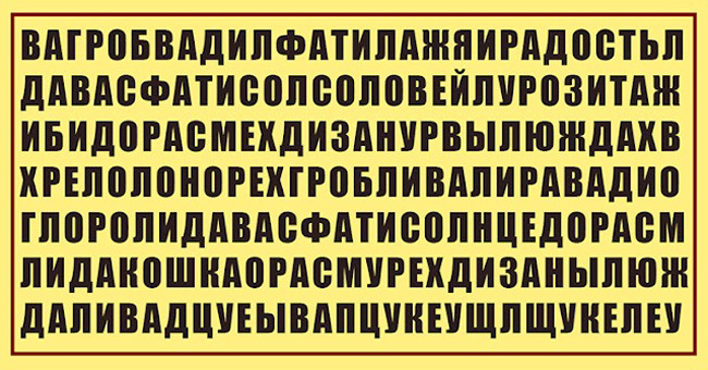 Сегодня мы предлагаем вам интересный тест, который немного расскажет о том, какое будущее вас ожидает и сумеете ли вы разглядеть хорошее. Итак, перед вами матрица, составленная из букв. Вам нужно будет отыскать в них слова. То слово, которое вы увидите первым, станет ключом.