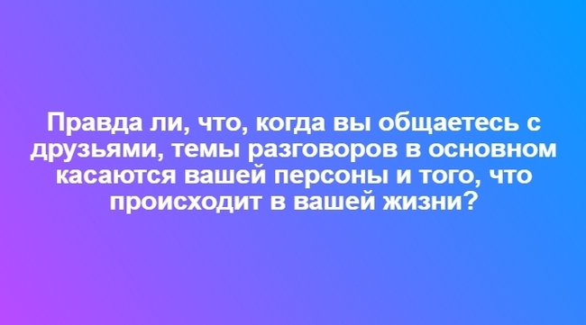 В современном мире постоянной карьерной и личностной конкуренции очень важно правильно идентифицировать свою личность. При этом любовь к себе не должна выходить за рамки, чтобы не оказать пагубное влияние на развитие характера. Тест на эгоизм поможет разобраться, можете ли вы получать удовольствие от искреннего чувства к другому или вам важно лишь собственное я? Ведь эгоцентризм иногда развивается незаметно, а полезным бывает исключительно в малых дозах. Вопросы на эгоистичность — это хороший повод изменить себя к лучшему.