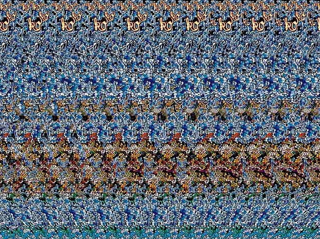 Новичкам советуется поднести лицо в упор к стереокартинке, а затем медленно его отводить, либо смотреть как бы сквозь нее, так «скосить» глаза, чтобы фокусировка взгляда была за ней на некотором расстоянии, а картинка как бы расплылась. Получится может не с первого раза и даже не со второго. А у некоторых объемное изображение так и не появляется.