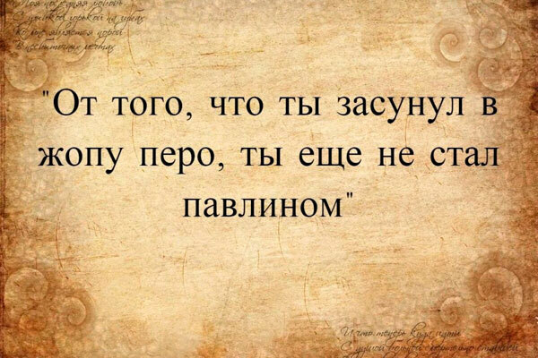 «Если у тебя перо в заднице, это еще не значит, что ты павлин». Неожиданно, с юмором, с долей иронии. Но можете ли вы определить, откуда эта цитата?