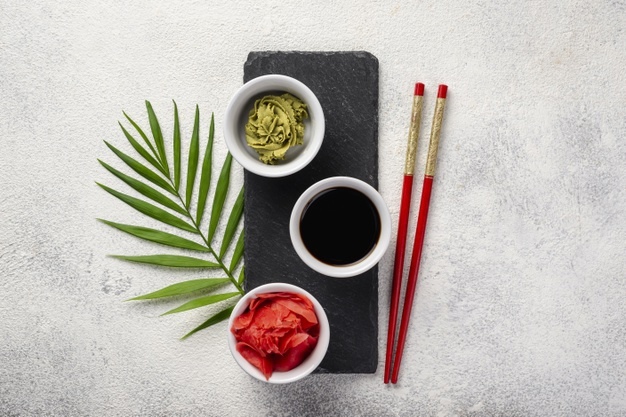 - Соевый соус, васаби и имбирь