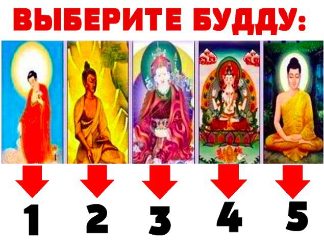 В этом тесте мы предлагаем вам выбрать Будду. Но и тут не всё так просто, ведь стоит помнить, что не вы выбираете Будду, а Будда выбирает вас - то есть он как бы неосознанно влияет на ваше сердце и интуицию. Перед тем, как выбрать одного Будду, посмотрите в глаза каждому - именно этот критерий является определяющим.
